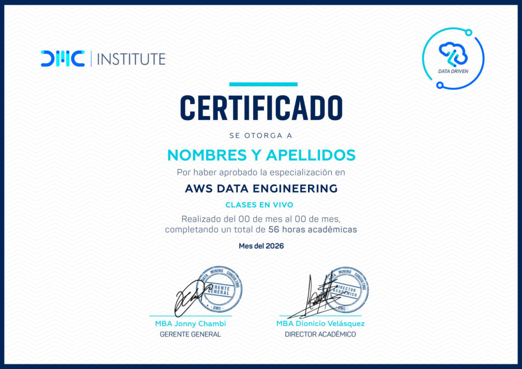 Por ello, DMC INSTITUTE ha diseñado la Especialización AWS Data Engineering que te permitirá aprender a diseñar, implementar y escalar arquitecturas de datos modernas utilizando lo mejor de la nube de Amazon. Aprovecharás las capacidades serverless, el procesamiento en tiempo real (streaming) y el almacenamiento masivo para transformar datos en valor, sin preocuparte por la infraestructura subyacente.