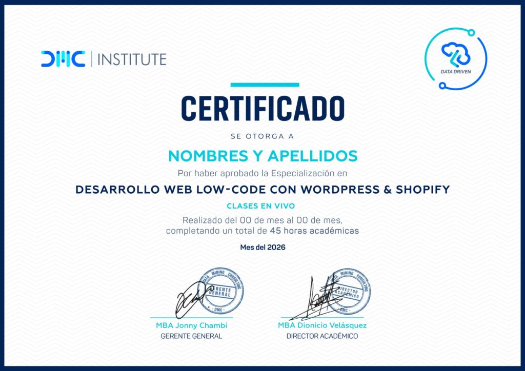 Por ello, DMC INSTITUTE ha diseñado la Especialización en Desarrollo Web Low -Code con WordPress & Shopify, un programa donde dejas de ser usuario de plataformas para convertirte en implementador profesional. A partir de tus conocimientos básicos de HTML y CSS, dominarás todo el flujo: ideación estratégica, implementación con IA integrada, deploy a producción y entrega con estándares de agencia. No se trata solo de crear sitios sin código, sino de hacerlo con criterio profesional