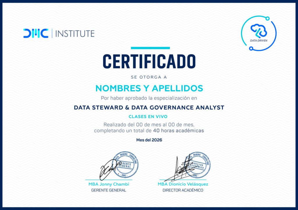 DMC INSTITUTE presenta la Especialización en Data Steward & Data Governance Analyst, diseñada para que asumas el rol clave que toda estrategia de datos necesita: convertir el plan de gobierno de datos en acciones concretas. Aprenderás a definir el linaje de datos, construir diccionarios y catálogos, gestionar metadatos y datos maestros, y asegurar que la data de tu organización sea confiable, consistente y lista para generar valor real en el negocio, incluso en contextos de inteligencia artificial.