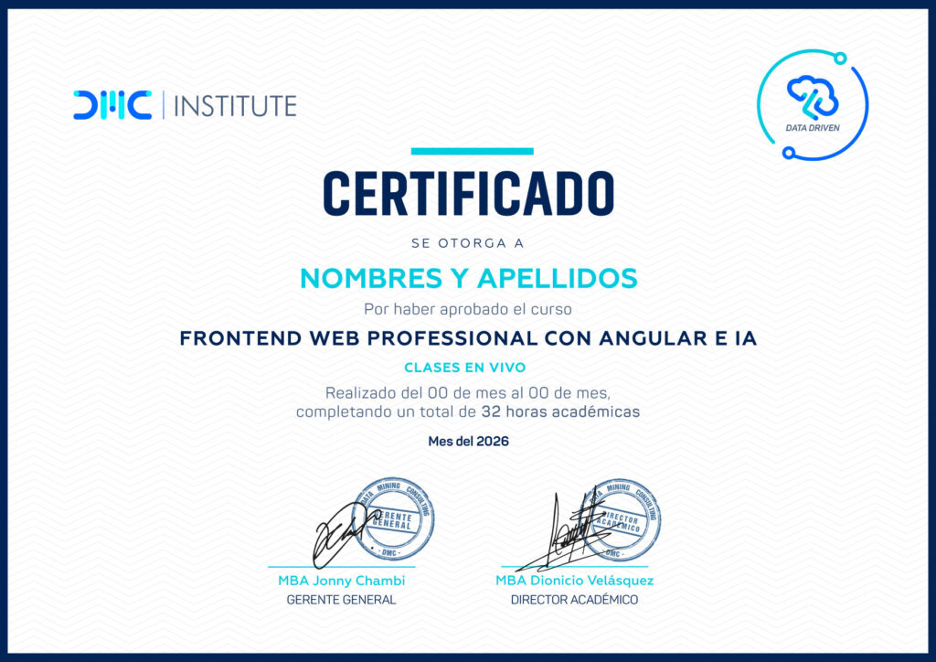 Por ello DMC INSTITUTE ha diseñado el Curso Frontend Web Professional con Angular, que te permitirá emplear esta plataforma y aprovechar al máximo la arquitectura basada en componentes para el desarrollo de aplicaciones web robustas y totalmente escalables para entornos reales, tanto empresas privadas e instituciones nacionales.