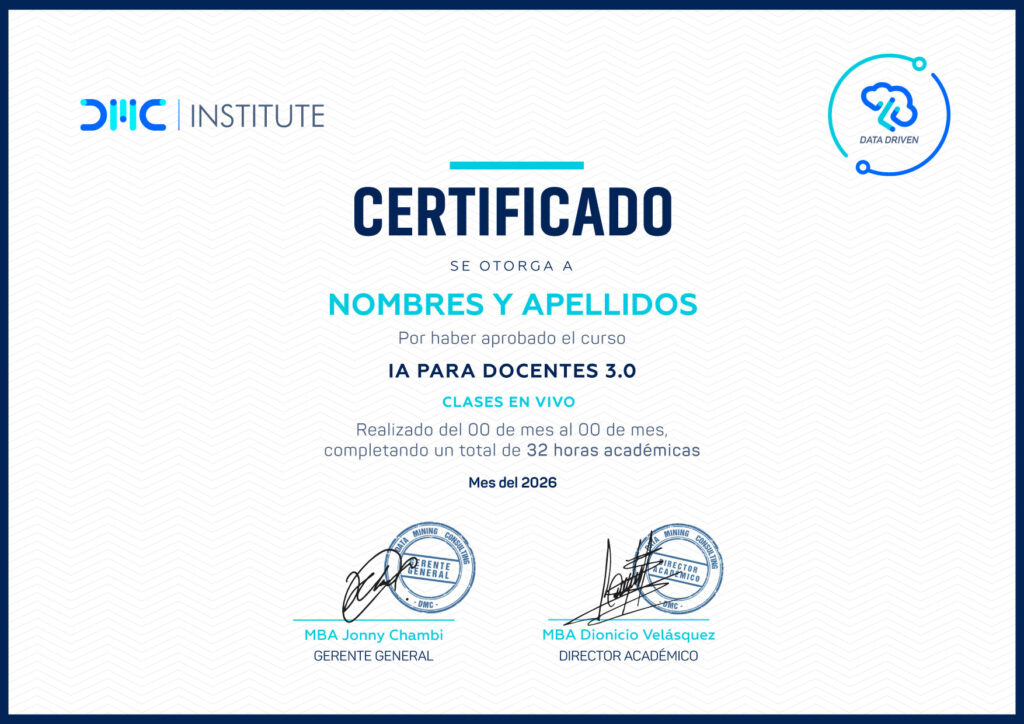 En el Curso IA para Docentes 3.0 aprenderás a planificar, crear materiales, diseñar evaluaciones y aplicar Augmented Learning usando herramientas como ChatGPT, Canva, Copilot y más. Todo 100% práctico, en vivo y aplicable desde la primera sesión.