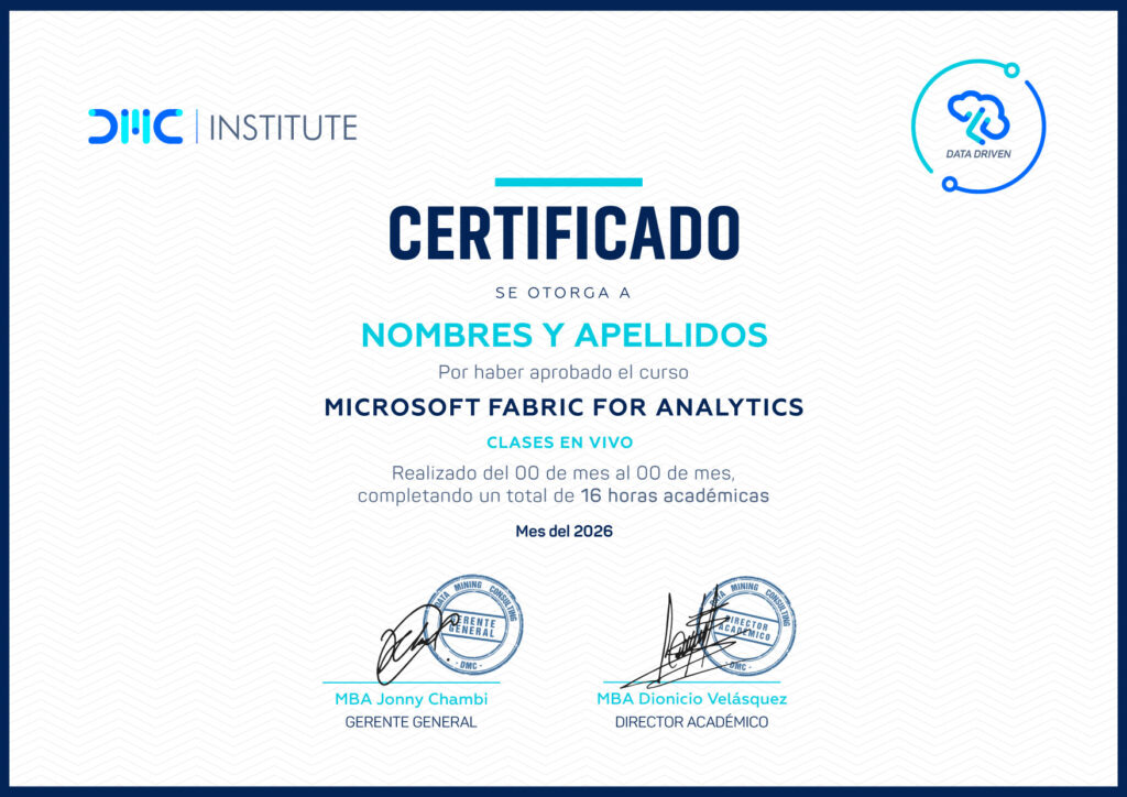 El curso Microsoft Fabric for Analytics te prepara para diseñar e implementar soluciones modernas de Data Warehouse en la nube utilizando el ecosistema unificado de Microsoft Fabric en Azure. Aprenderás a integrar datos desde múltiples fuentes (Excel, CSV y motores SQL), estructurarlos bajo esquemas estrella o snowflake, y ponerlos a disposición del negocio mediante modelos listos para su explotación en Power BI.