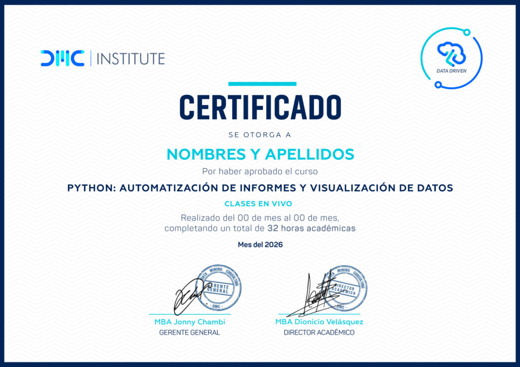Aprenderás a usar Python y sus librerías especializadas —Matplotlib, Seaborn y Plotly— para generar gráficos de alto impacto y automatizar su exportación a Word, PowerPoint e integración con Power BI, convirtiéndote en un analista capaz de construir procesos reproducibles que eliminan el trabajo manual repetitivo.